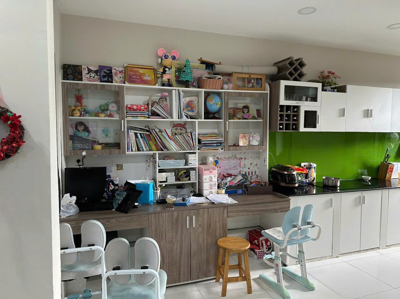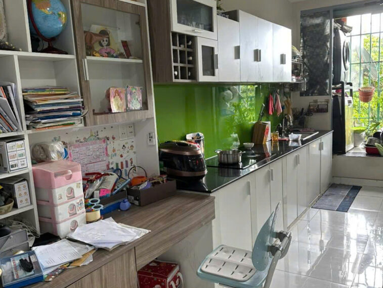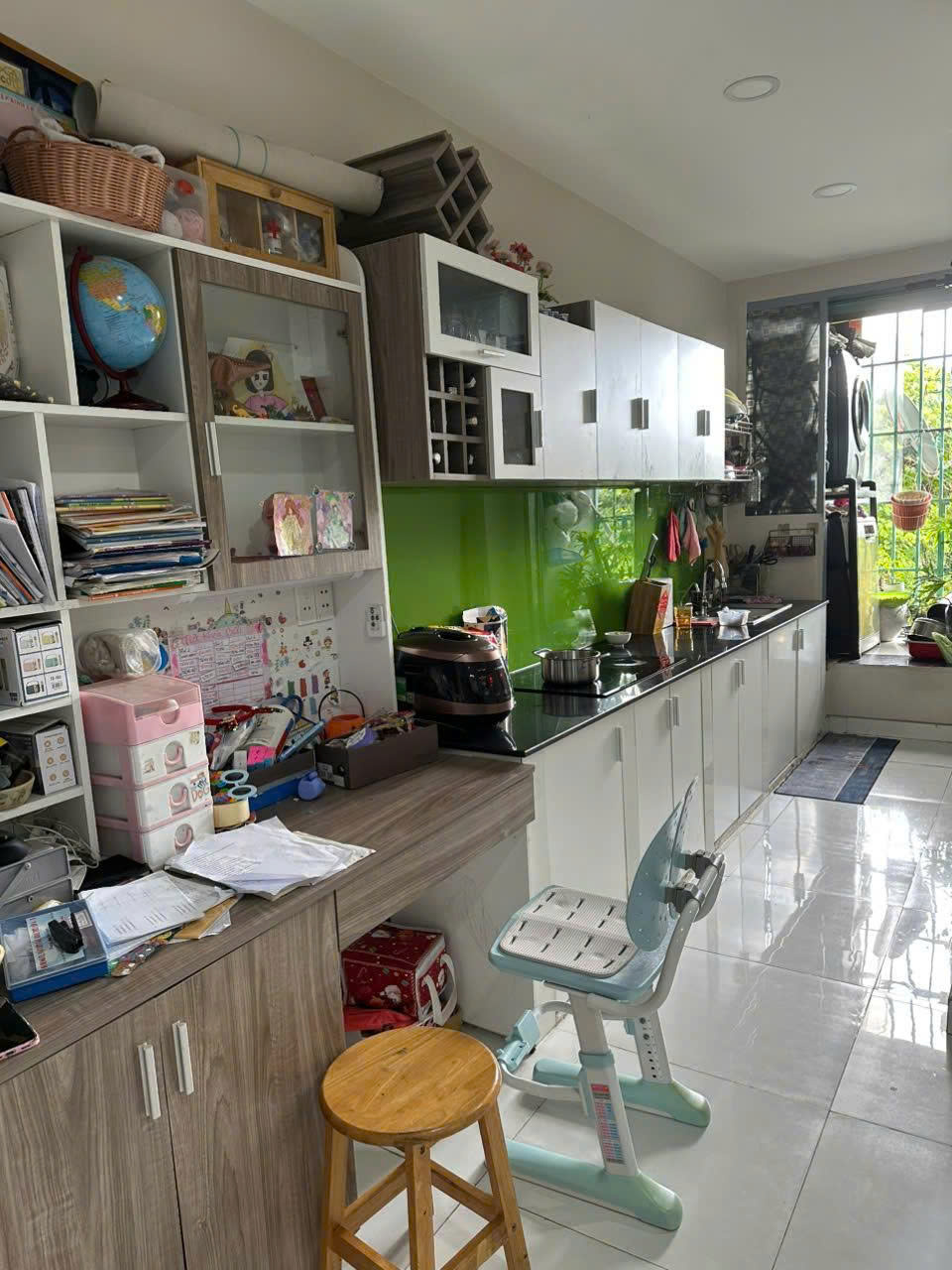 Nội thất đầy đủ: 2 bàn học/bàn làm việc + kệ sách, hệ bếp trên dưới hoàn thiện, bếp từ, nhiều vật dụng nội thất khác