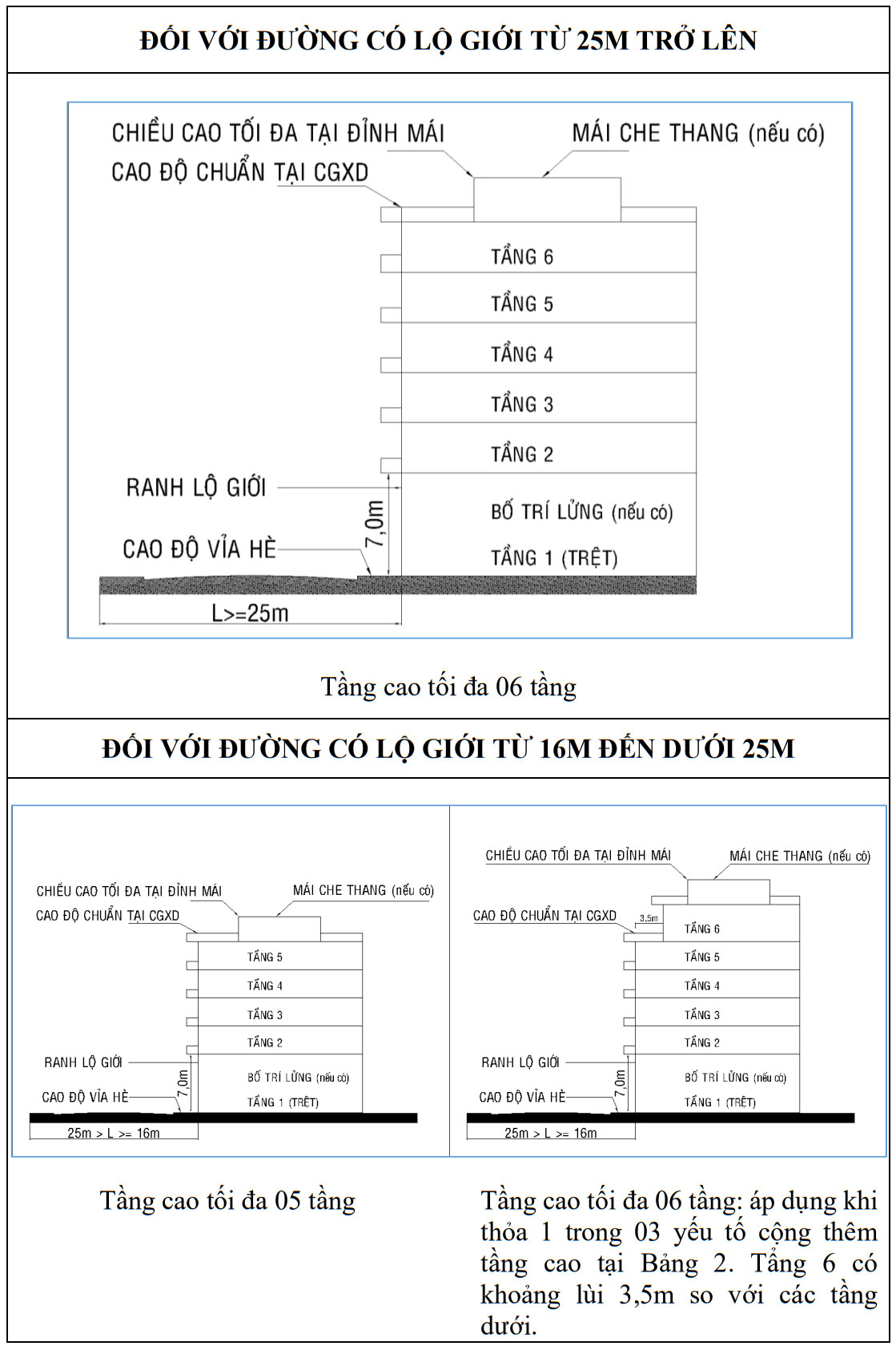 Lộ giới (L) từ 12m đến 20m, số tầng nhà được xây dựng từ 4 tầng – 7 tầng, với các trường hợp sau: