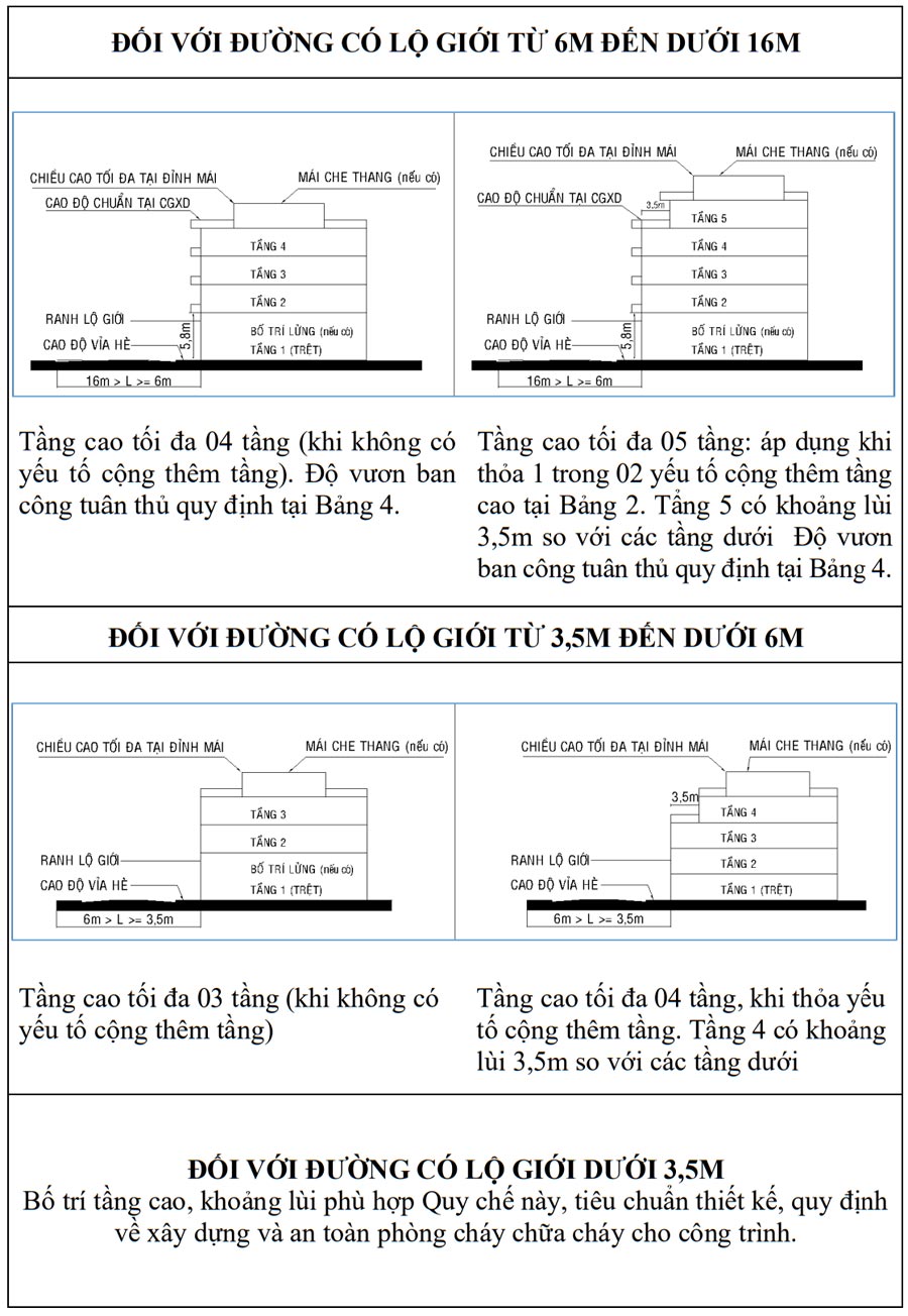 Số tầng nhà và chiều cao công trình được phụ thuộc vào lộ giới đường theo bảng sau: